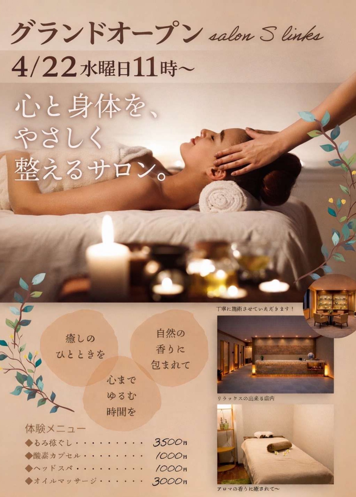 訪れるすべての方に、「安心」「癒し」「笑顔」をお届けできるよう、心を込めてお迎えいたします。